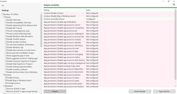 Select the settings and click on ANALYZE push button to know what all settings are configured on your PC. If you want to disable the selected settings, click on Apply Selected. In example you lot want to go back to the default settings, click on the Revert Selected button and you are washed. Privatezilla overall makes it all a lot easier and quicker. You can check all these settings and change them in simply a few clicks.